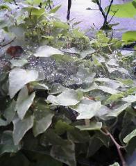 朝、鉢植えの蜘蛛の巣の雨のしずくが反射して、光っていました。娘の発見でとても気持ちいい朝になりました☆
